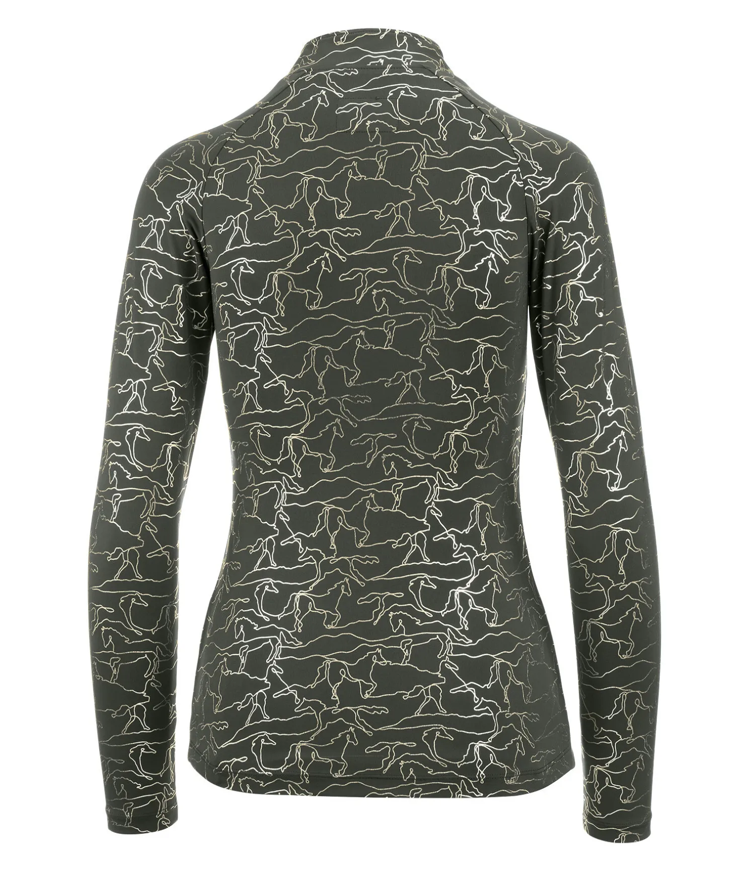 T-shirt technique à manches longues. Imprimé métallisé cheval all-over. Manches raglan. Col montant zippé avec protège-menton. Matière respirante. Séchage rapide. 88 % polyester, 12 % élasthanne.