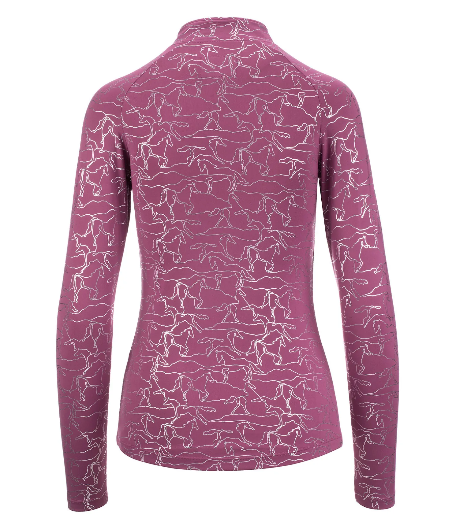 T-shirt technique à manches longues. Imprimé métallisé cheval all-over. Manches raglan. Col montant zippé avec protège-menton. Matière respirante. Séchage rapide. 88 % polyester, 12 % élasthanne.
