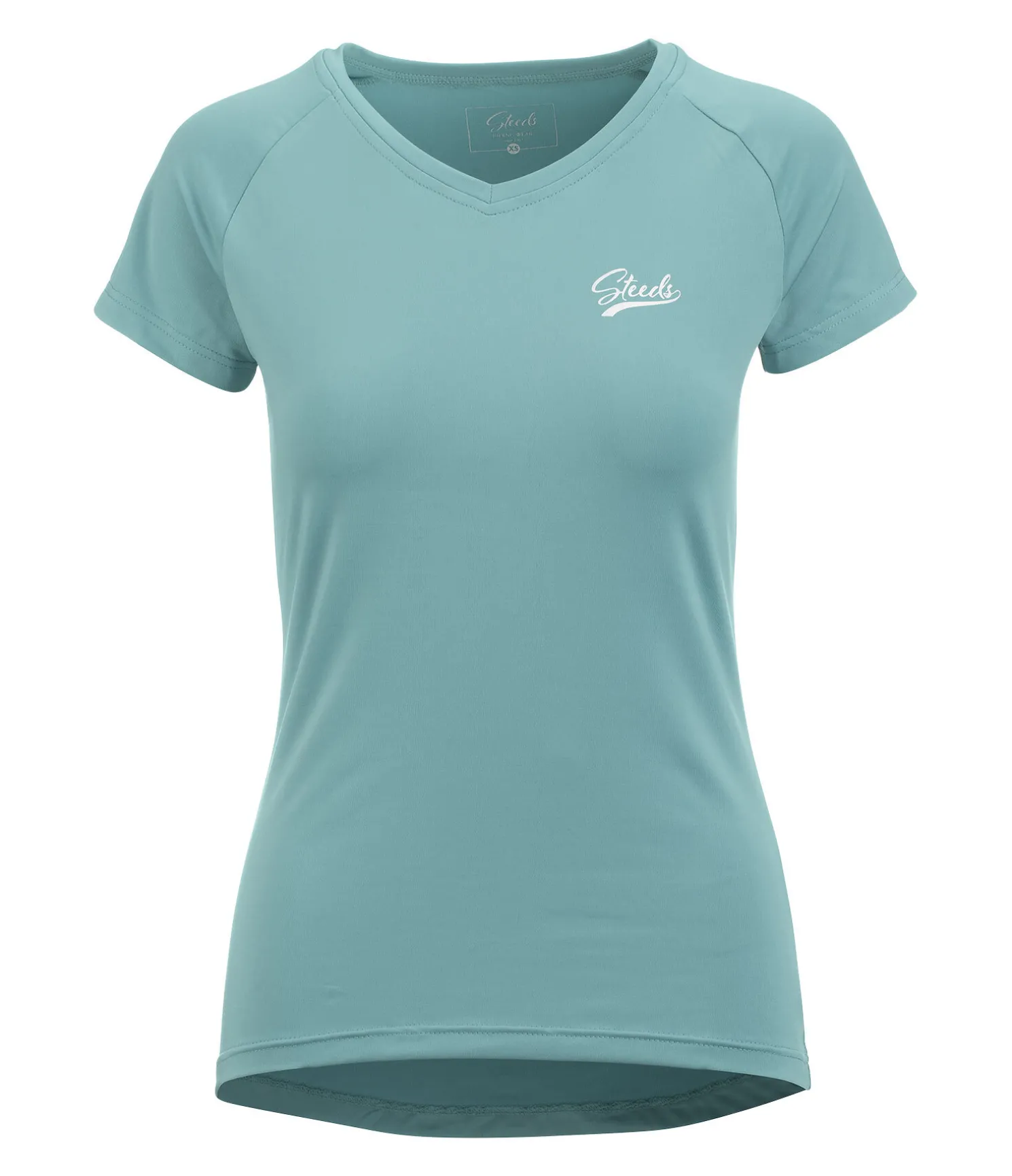 T-shirt col en V à manches courtes. Doux et extensible. Matière respirante à séchage rapide. Imprimé argenté sur la poitrine. 88 % polyester, 12 % élasthanne.