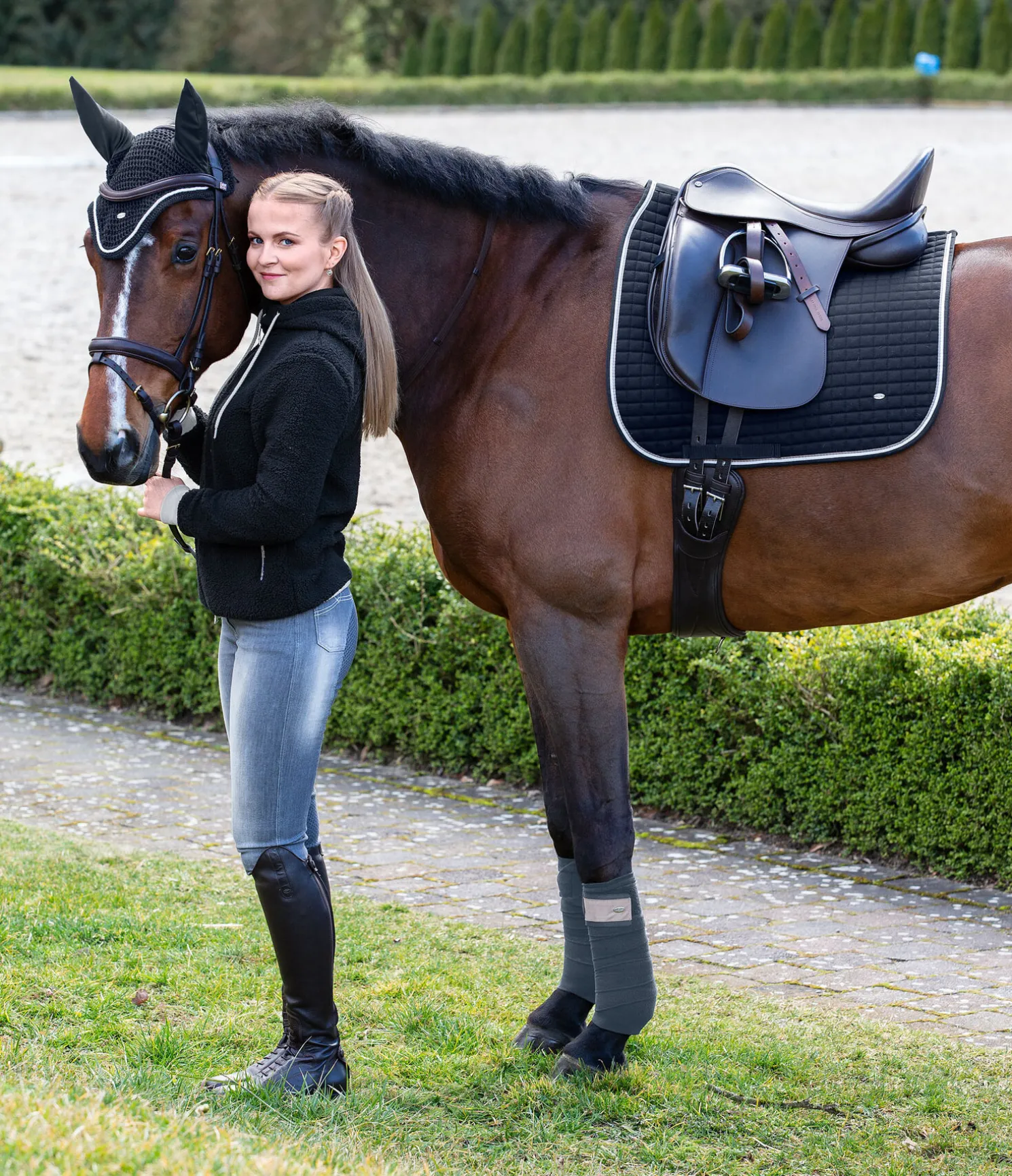 Tapis de selle en coton sobre et indéformable grâce au matelassage resserré, avec bordure colorée et petite plaque métallique argentée avec logo gravé. Passants de sangle et de contre-sanglons avec patte auto-agrippante pratique. Dessous en Air mesh respirant et absorbant l’humidité. Dessus 100 % coton, rembourrage et dessous 100 % polyester.
