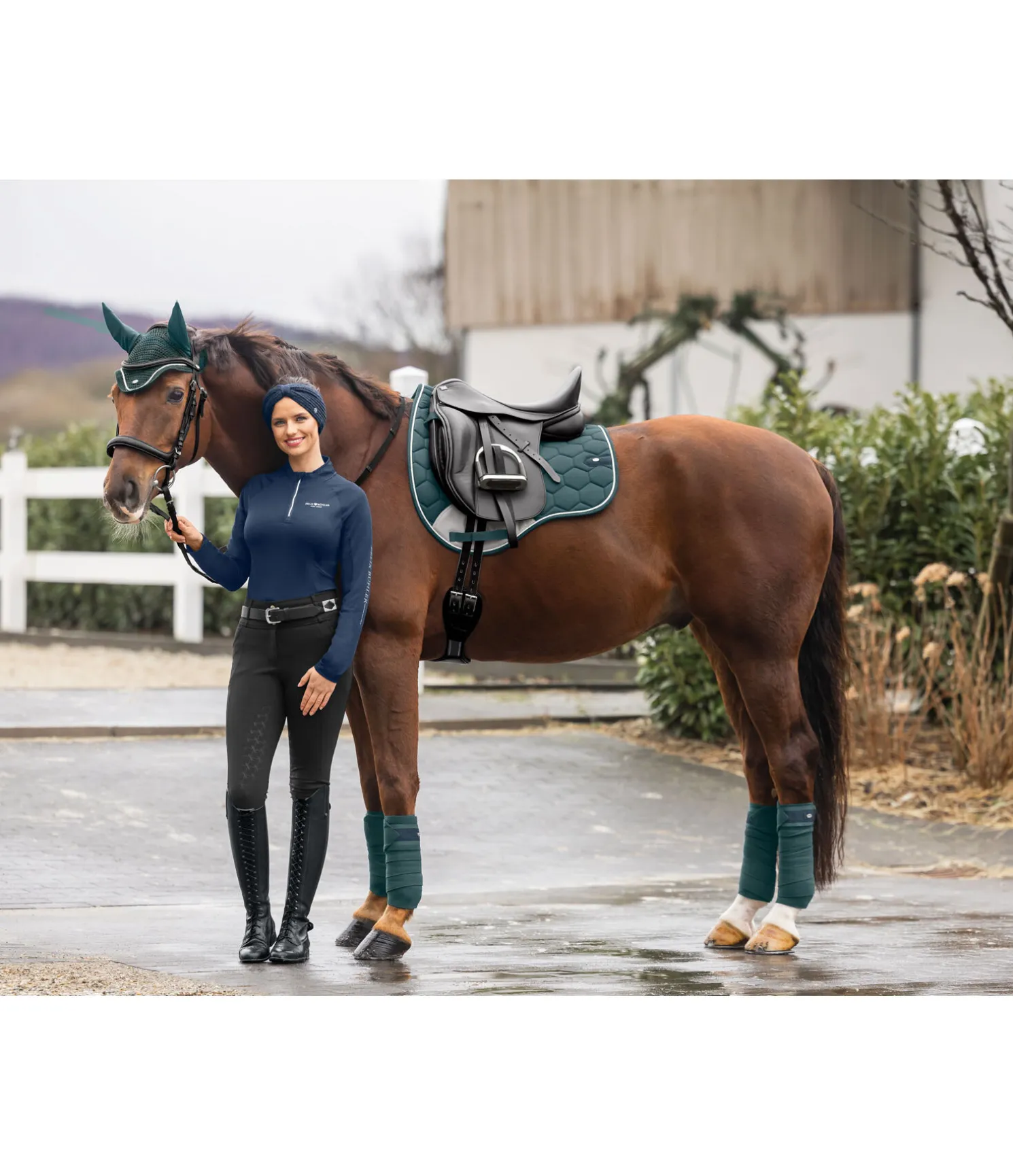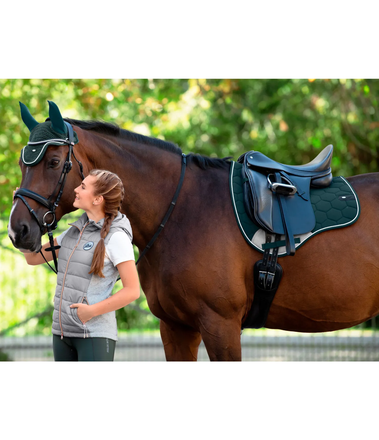Tapis de selle dans une coupe sportswear avec protection contre les frottements de couleur contrastante à l’aspect velours au passage de sangle. Petite plaque argentée filigrane avec logo gravé de chaque côté et cordon décoratif discret satiné de couleur contrastante. Passants de sangle et de contre-sanglons avec patte auto-agrippante pratique. Dessous en Air mesh respirant et absorbant l’humidité. Dessus 100 % coton, rembourrage et dessous 100 % polyester.