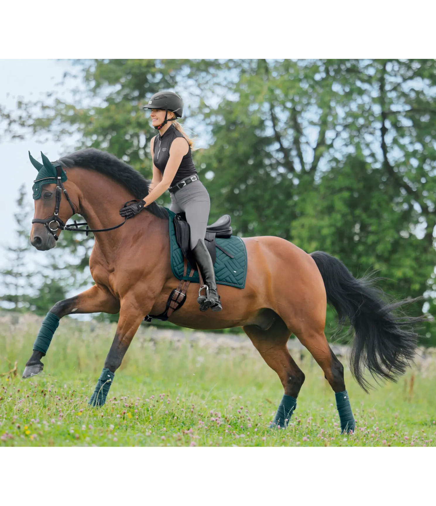 Tapis de selle de forme carrée, particulièrement élégant, avec surpiqûres apparentes. Passepoil avec strass. Petit médaillon discret avec logo gravé. Passants de sangle et de contre-sanglons avec patte auto-agrippante fonctionnelle. Dessous Air mesh respirant et absorbant l’humidité. 100 % polyester.