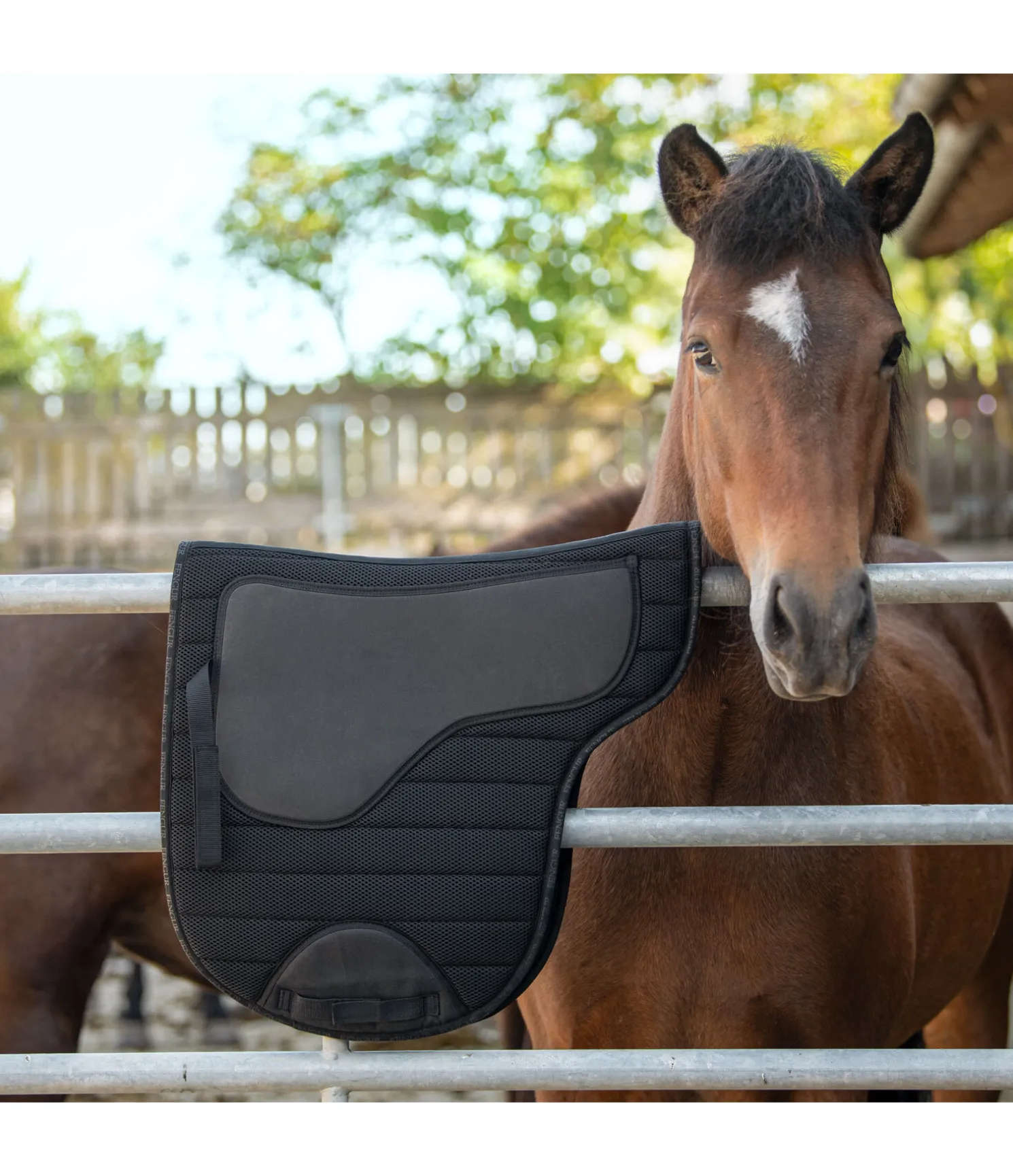 Tapis de selle sportif et respirant en tissu mesh. Avec pad cousu en caoutchouc chloroprène pour réduire la pression au niveau de la selle. Coupe anatomique. Longueur de dos 56 cm, hauteur 56 cm. 100 % polyester.