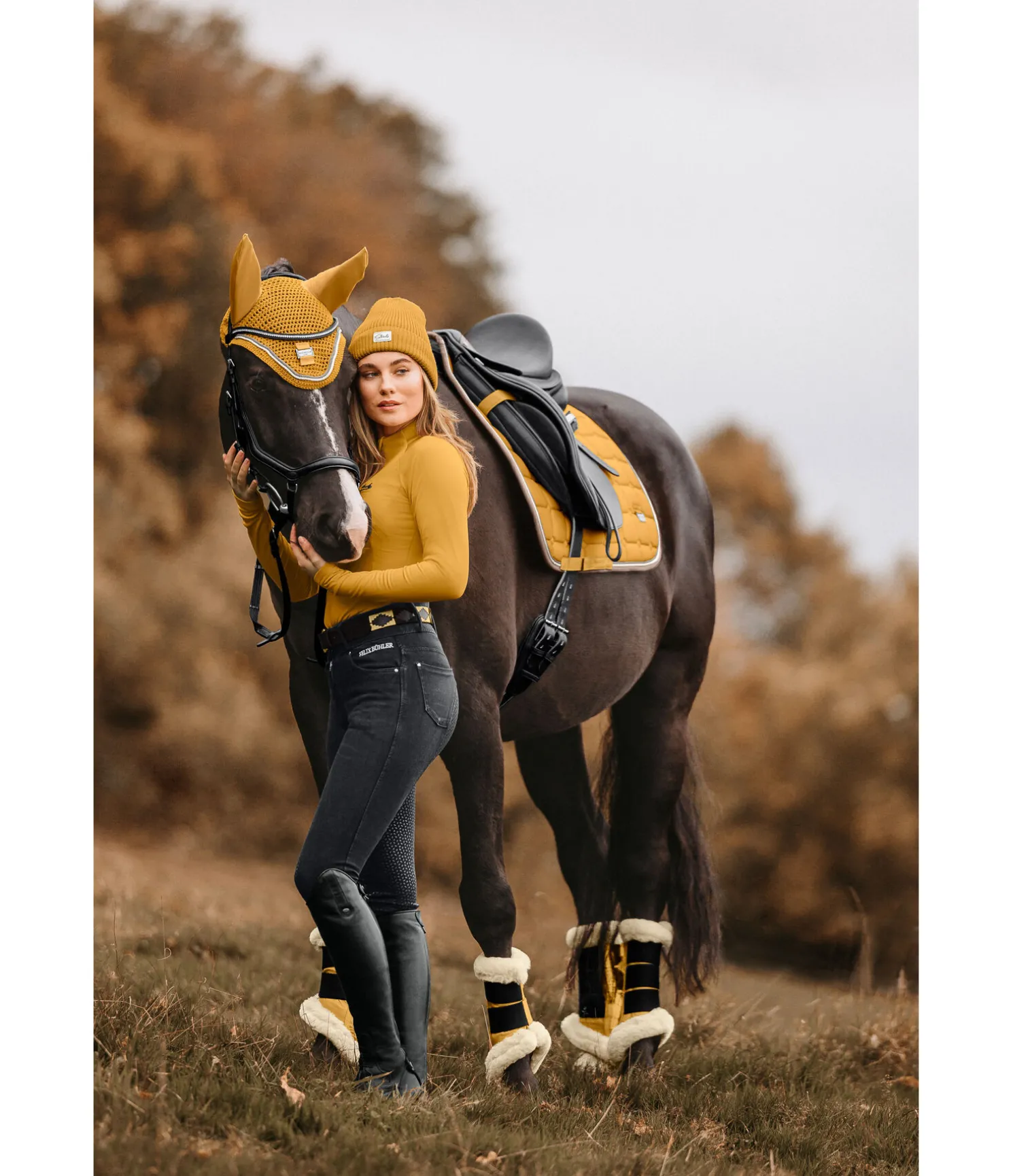 Tapis de selle élégant en tissu satiné et brillant avec grip en silicone dans la zone de la selle pour un maintien idéal. Détails élégants comme le double cordon décoratif et une plaque métallique de couleur assortie avec logo de chaque côté. Passants de sangle et de contre-sanglons avec patte auto-agrippante pratique. Doublure en mesh respirant et absorbant l’humidité. 100 % polyester.