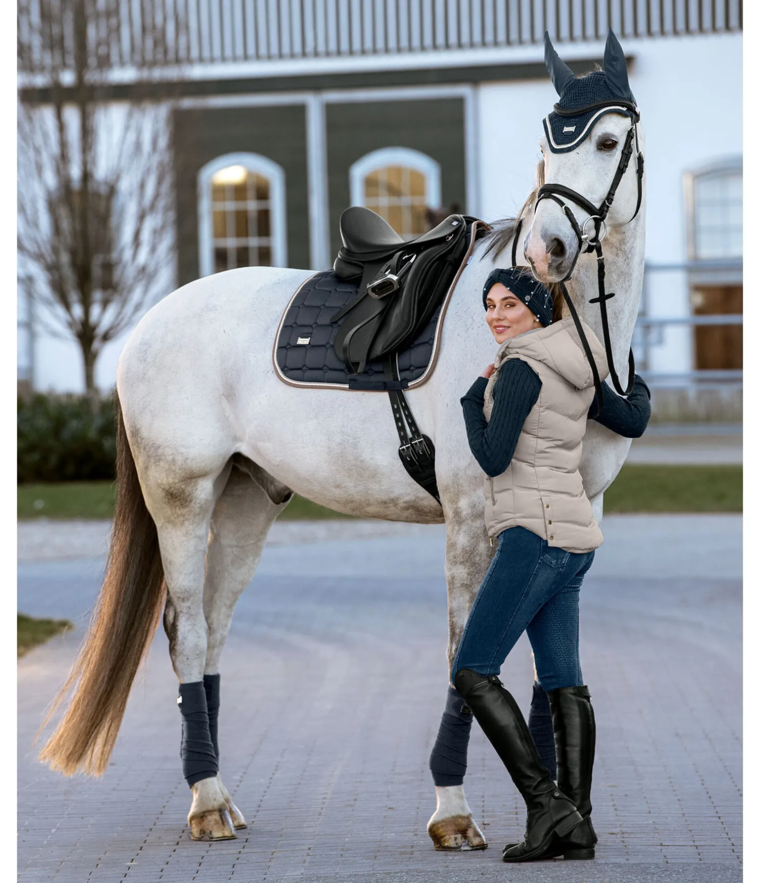 Tapis de selle élégant en tissu satiné et brillant avec grip en silicone dans la zone de la selle pour un maintien idéal. Détails élégants comme le double cordon décoratif et une plaque métallique de couleur assortie avec logo de chaque côté. Passants de sangle et de contre-sanglons avec patte auto-agrippante pratique. Doublure en mesh respirant et absorbant l’humidité. 100 % polyester.