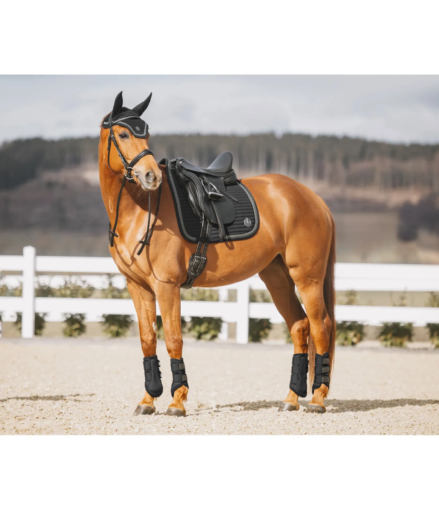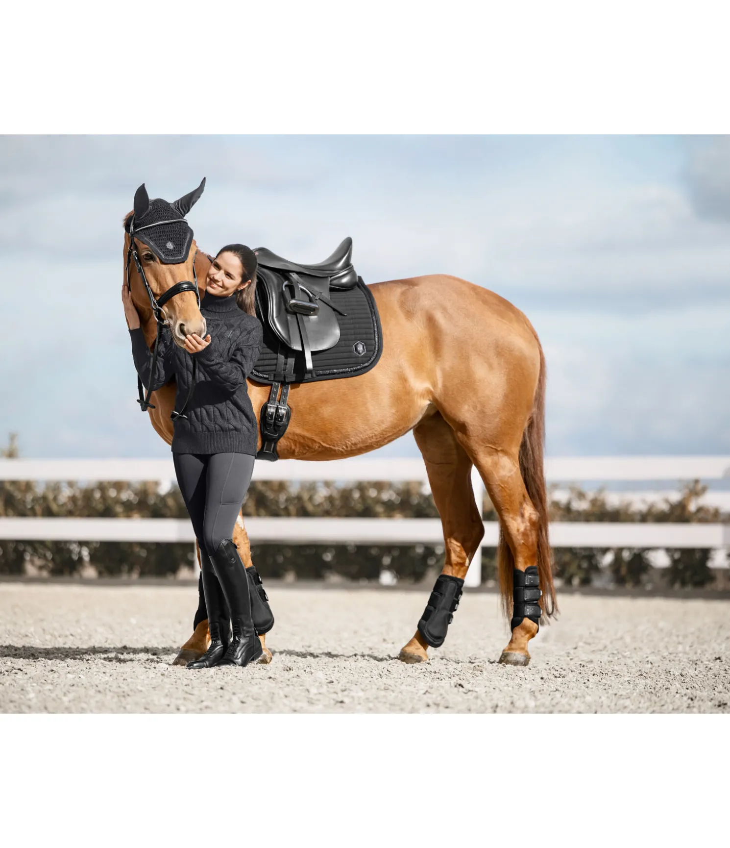 Tapis de selle élégant et sportif avec bande scintillante de couleur assortie et logo ton sur ton. Insert en mesh particulièrement respirant le long du dos pour une aération optimale. Dessus en matière lisse, souple et anti-salissures. Surpiqûre horizontale sportive. Passants de sangle et de contre-sanglons avec pattes auto-agrippantes pratiques. Dessous en Air mesh respirant et absorbant l’humidité. 100 % polyester.