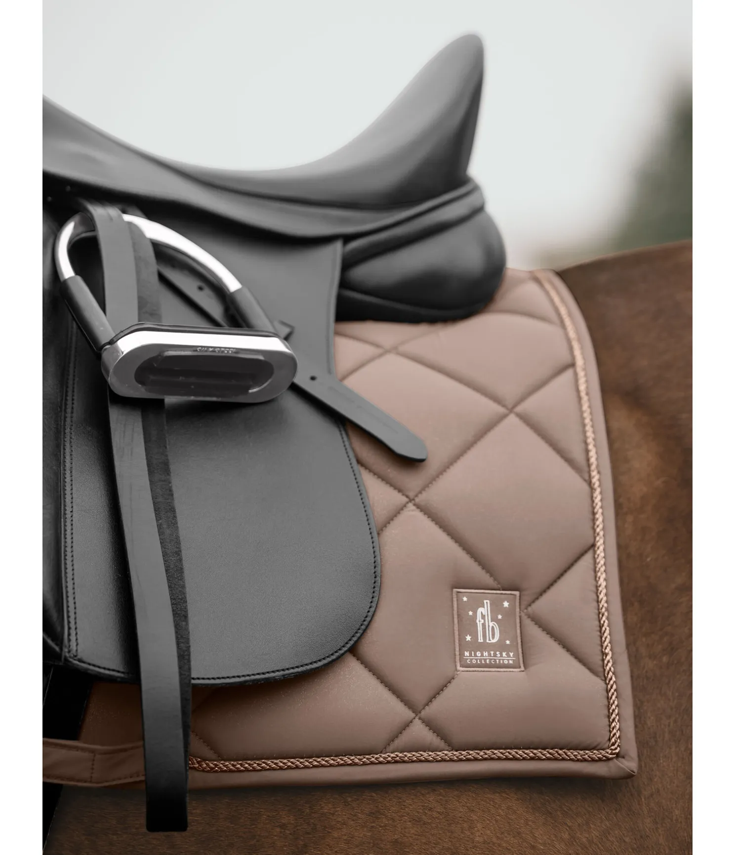 Élégant tapis de selle de forme carrée avec un soupçon de paillettes sur toute la matière supérieure et cordon décoratif scintillant. Logo de couleur assortie. Passants de contre-sanglons amovibles et passants de sangle avec pattes auto-agrippantes pratiques. Dessous en Air mesh respirant et absorbant l’humidité.