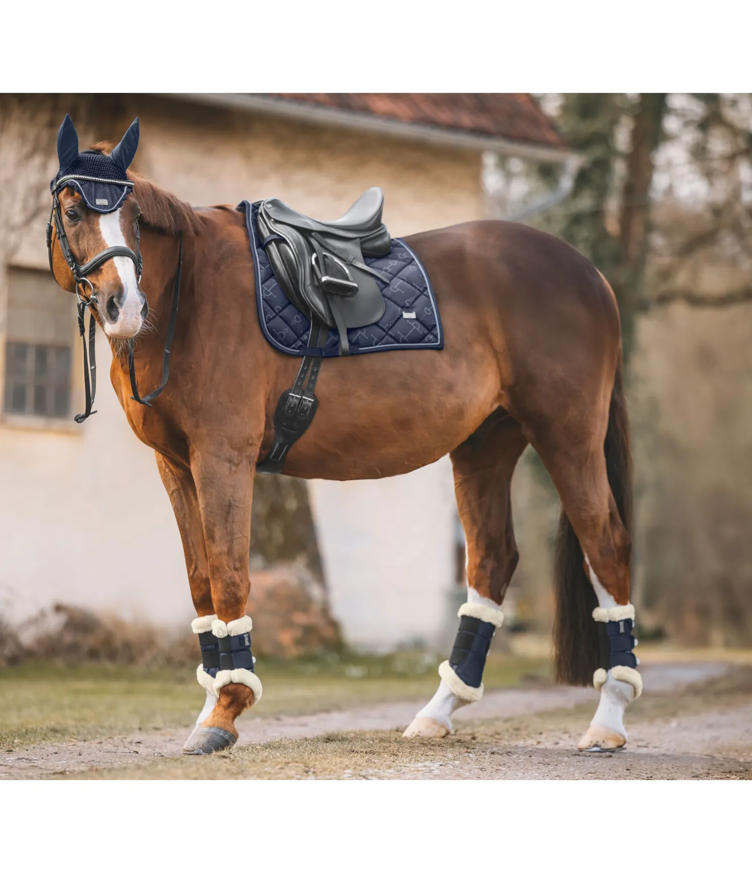 Élégant tapis de selle de forme carrée avec plaque logo métallique de chaque côté. Cordon décoratif anthracite et imprimé all-over discret à motif mors tendance. Passants de sangle et de contre-sanglons avec pattes auto-agrippantes pratiques. Dessous en Air mesh respirant et absorbant l’humidité. 100 % polyester.
