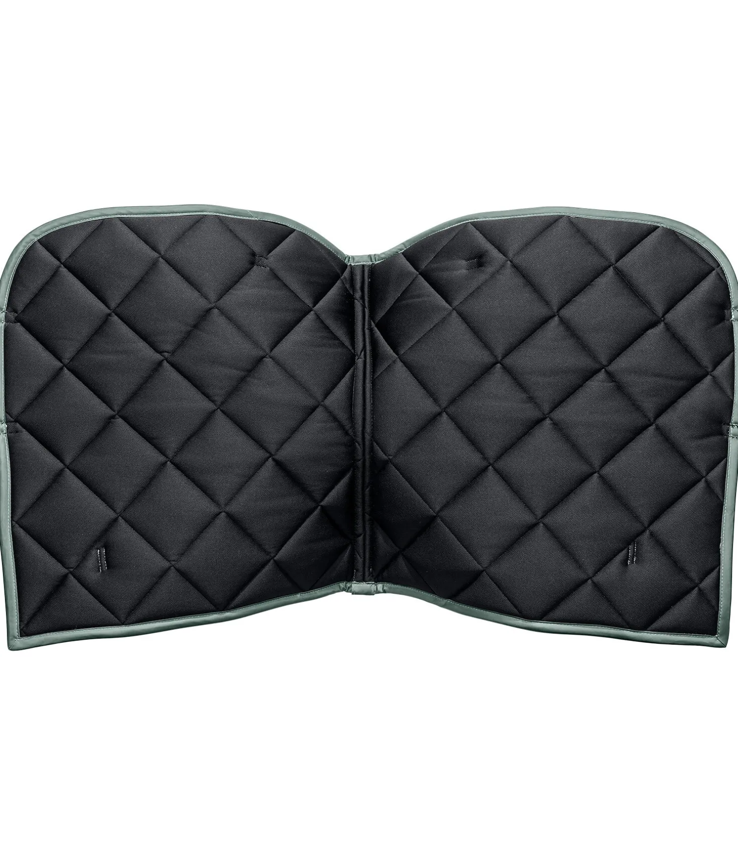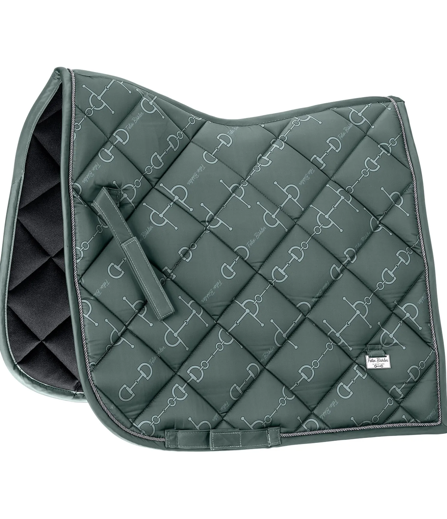 Élégant tapis de selle de forme carrée avec plaque logo métallique de chaque côté. Cordon décoratif anthracite et imprimé all-over discret à motif mors tendance. Passants de sangle et de contre-sanglons avec pattes auto-agrippantes pratiques. Dessous en Air mesh respirant et absorbant l’humidité. 100 % polyester.