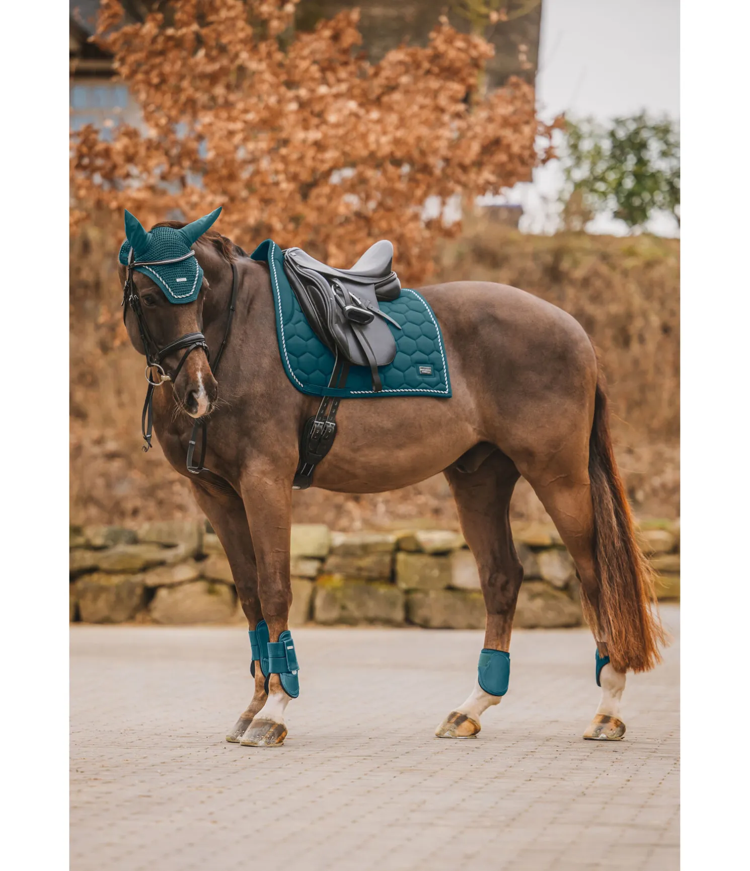Tapis de selle avec rembourrage à l’avant permettant de garder la selle en place sans passants de contre-sanglons. Coupe sportive avec angle droit et surpiqûre en losanges. Dessus en matière lisse anti-salissures, cordon décoratif de couleur assortie et plaque logo métallique classique. Passants de sangle avec patte auto-agrippante pratique. Dessous en Air mesh respirant et absorbant l’humidité. 100 % polyester.