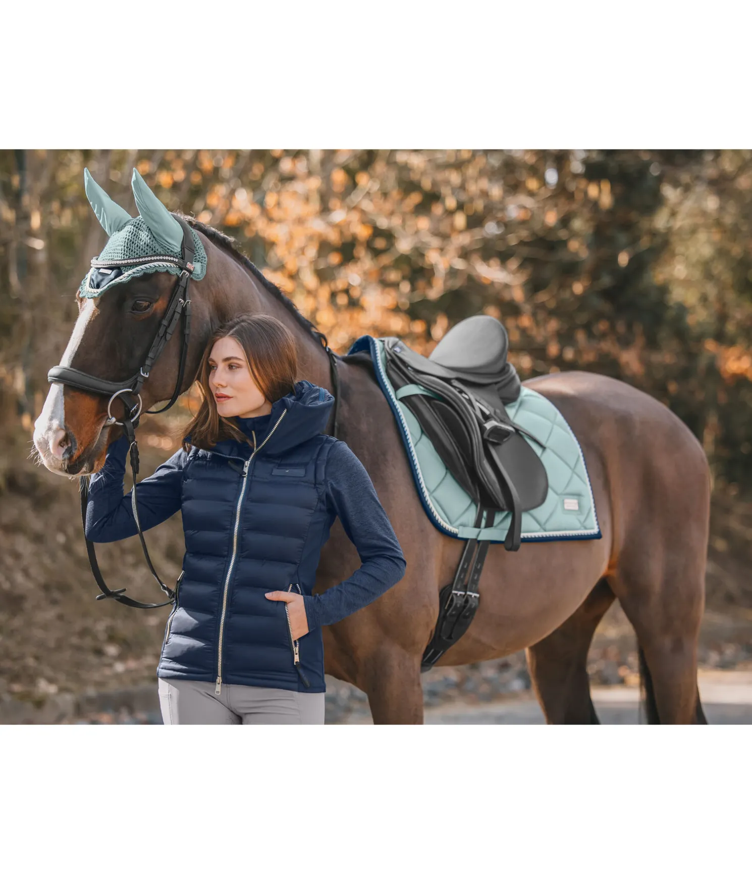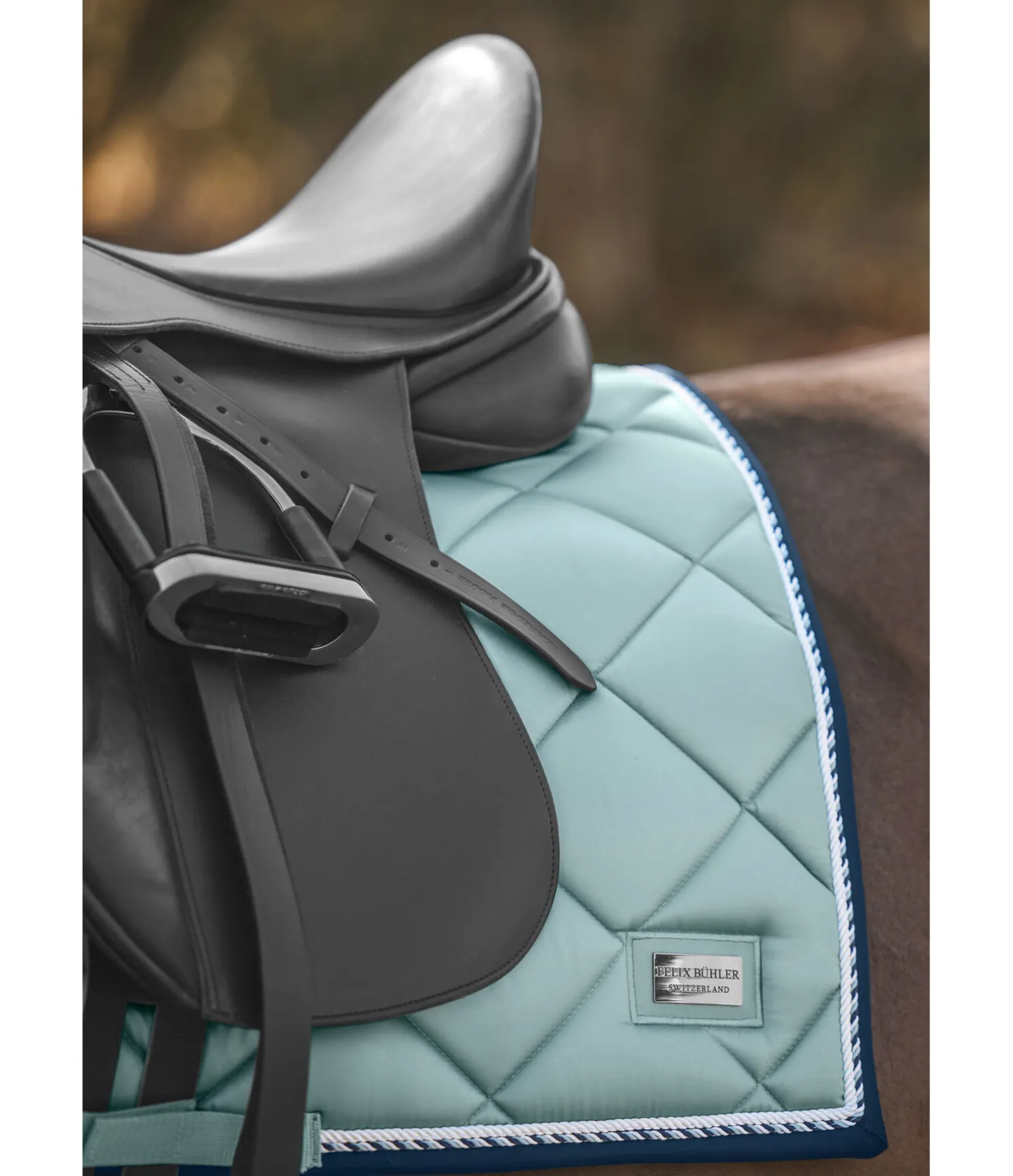 Tapis de selle de forme carrée. Petite plaque argentée avec logo. Tissu satiné. Cordons décoratifs de couleur assortie. Passants de sangle et de contre-sanglons avec patte auto-agrippante pratique. Dessous en Air mesh respirant et absorbant l’humidité. 100 % polyester.