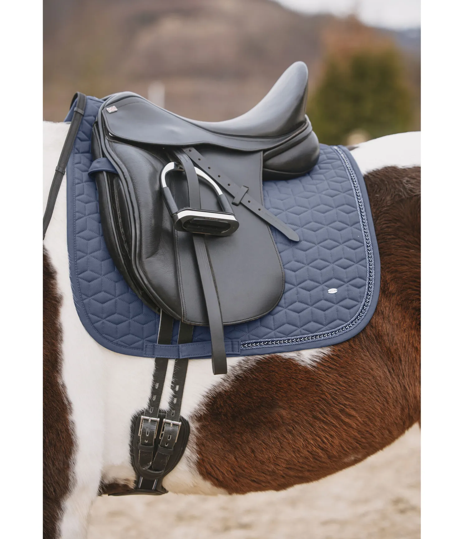 Tapis scintillant orné de petits strass sur un double cordon décoratif brillant. Plaque logo discrète et petite surpiqûre. Passants de sangle et de contre-sanglons avec pattes auto-agrippantes pratiques. Dessous en matière Air mesh respirante et absorbant l’humidité. 100 % polyester.