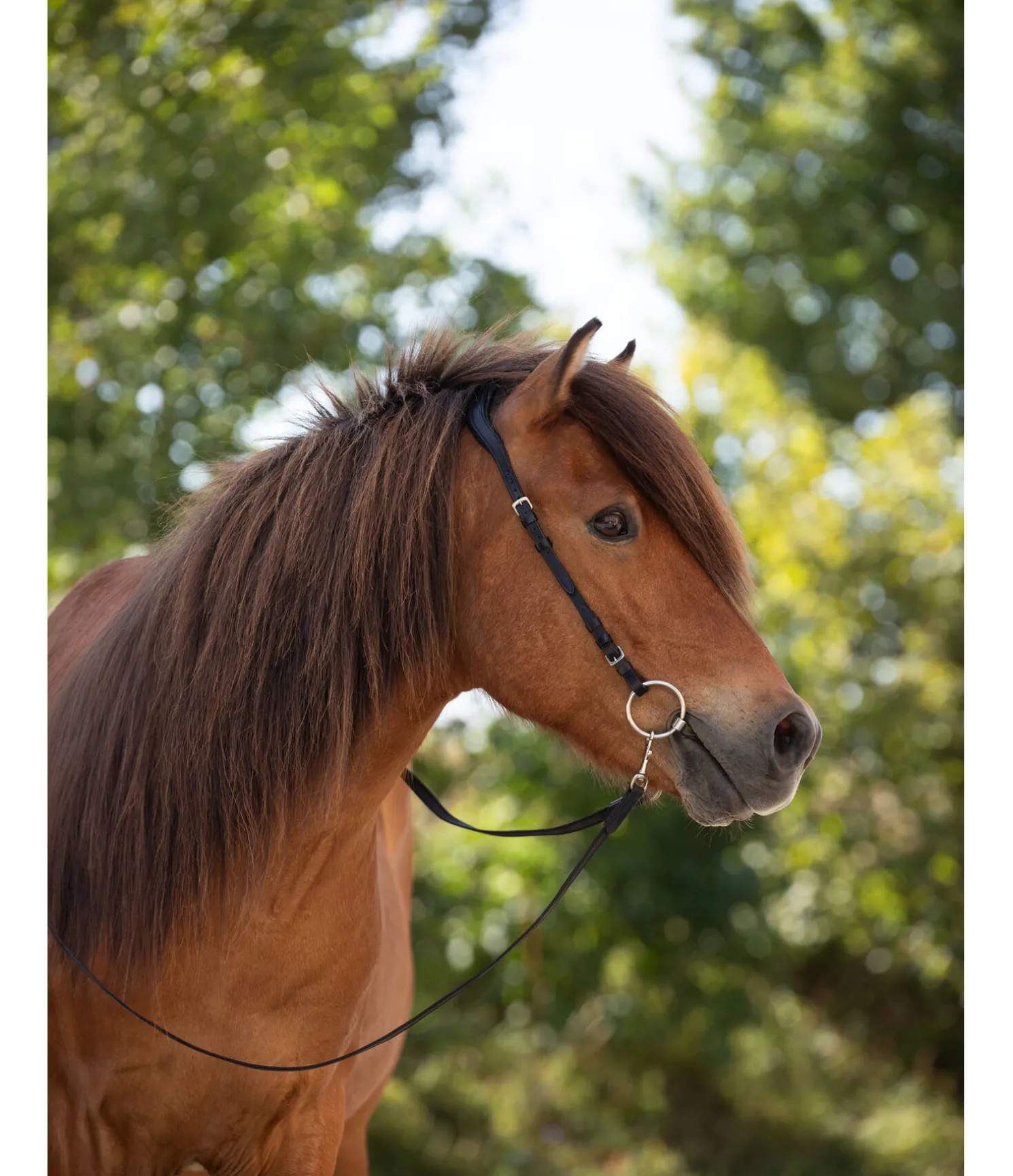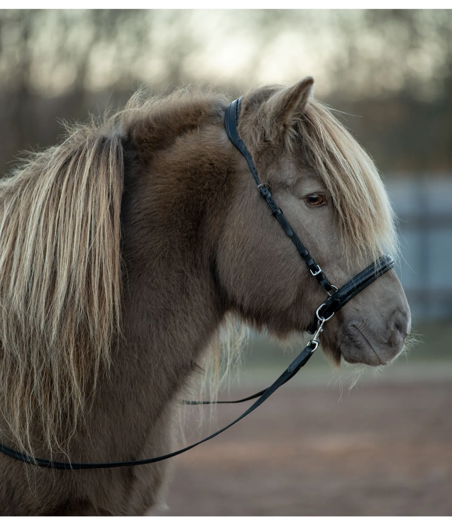 Têtière anatomique en cuir gras. Doublure moelleuse au niveau de la nuque. Les boucles élastiquées pour le mors assurent une position stable dans la bouche du cheval et soulagent la nuque.