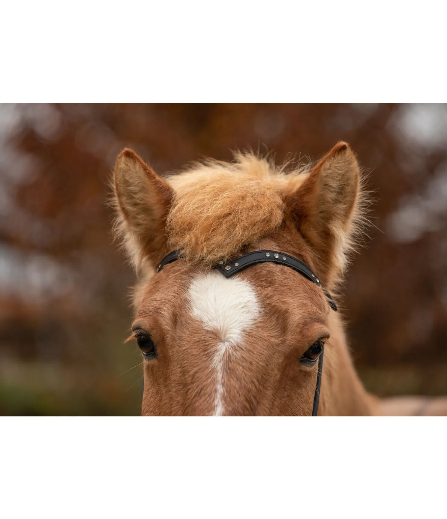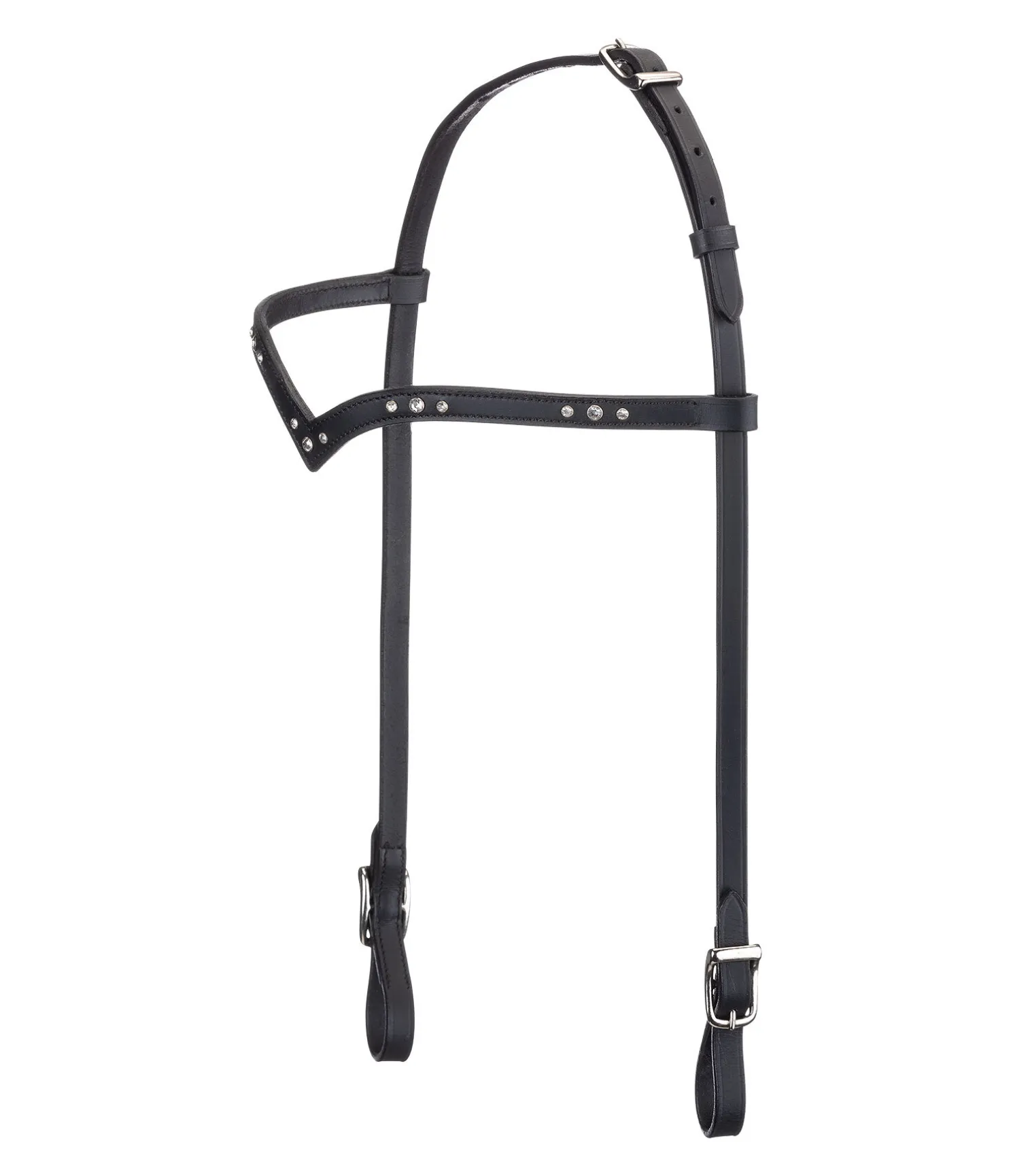 Fine têtière en cuir gras véritable. Frontal en V orné de strass. Bouclerie argentée.