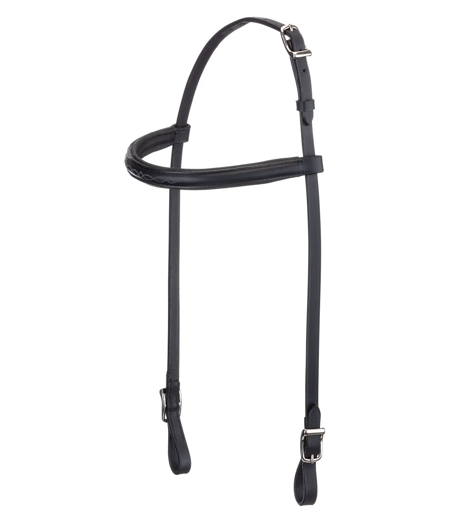 Têtière classique avec frontal droit bombé et fonçure décorative. Cuir gras véritable. Bouclerie argentée.