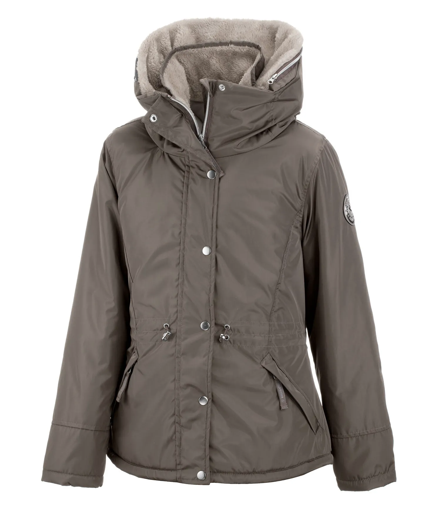 Veste d’équitation d’hiver technique, déperlante et coupe-vent. Matière respirante et chaude. Large col et capuche amovible doublés en polaire Teddy douce. Capuche rétractable dans le large col. Garnissage imitation duvet. Fermeture à glissière double sens dissimulée avec protège-menton. Deux poches zippées latérales dissimulées et une poche intérieure. Taille ajustable. Deux fentes cavalières avec boutons-pression à l’arrière. Badge logo Felix Bühler sur la manche. Fermeture à glissière et boutons-pression rose doré. 100 % polyester.