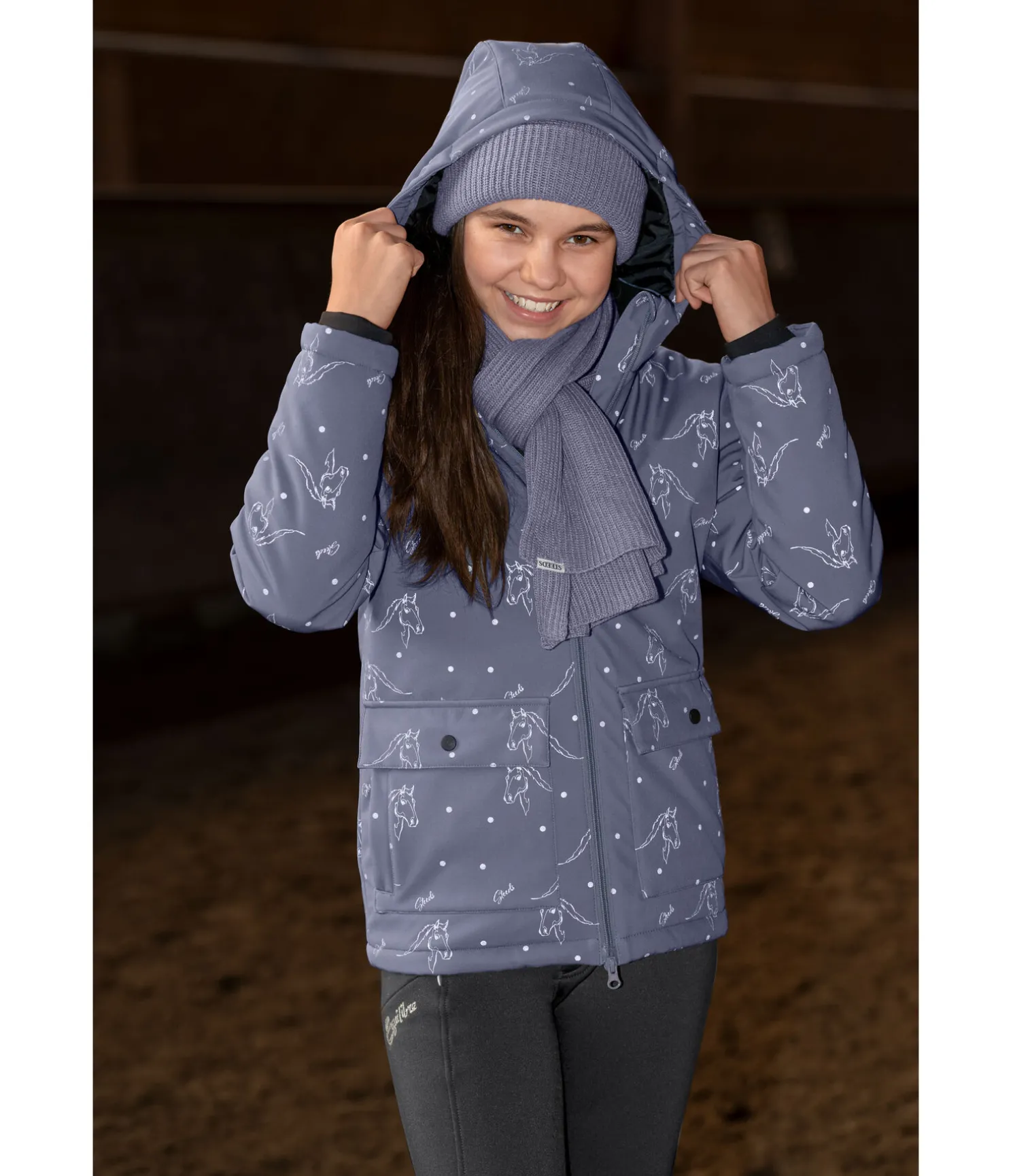 Veste softshell chaude avec imprimé réfléchissant all-over. Matière déperlante, coupe-vent et respirante. Col montant avec capuche. Bouton-pression pour fixer la capuche dans le dos. Fermeture à glissière double sens avec sous-patte et protège-menton. 2 poches à rabat avec bouton-pression et poches latérales. Bas des manches coupe-vent et élastiqué. Badge STEEDS sur la manche. 94 % polyester, 6 % élasthanne.