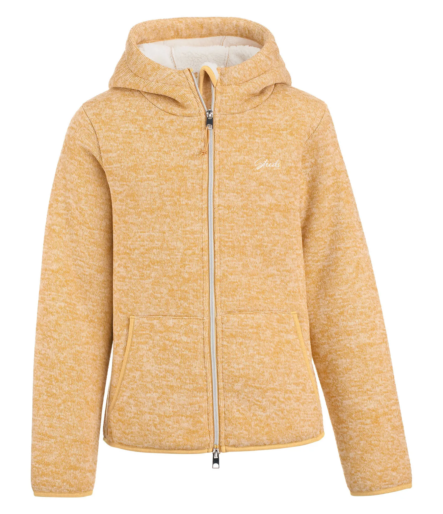 Jolie veste en tricot polaire. Aspect chiné. Logo discret brodé sur la poitrine. Intérieur et capuche doublés en polaire Teddy douce de couleur contrastante. Fermeture à glissière bidirectionnelle avec protège-menton. Deux poches latérales. 100 % polyester.