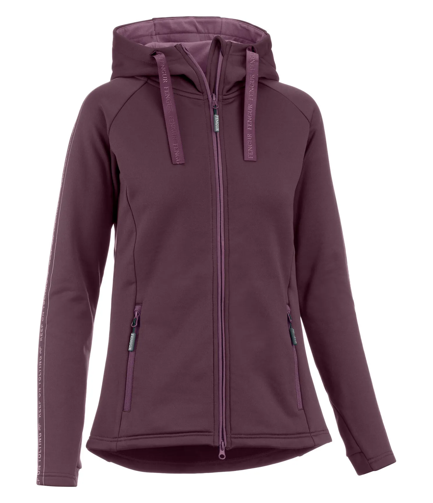 Veste à capuche technique et respirante avec intérieur doux. À séchage rapide. Fermeture à glissière double sens dissimulée, 2 poches zippées, capuche réglable par cordons de serrage et pouvant être fixée dans le dos. Avec inscription sur les manches et passe-pouce intégré. 93 % polyester, 7 % élasthanne.