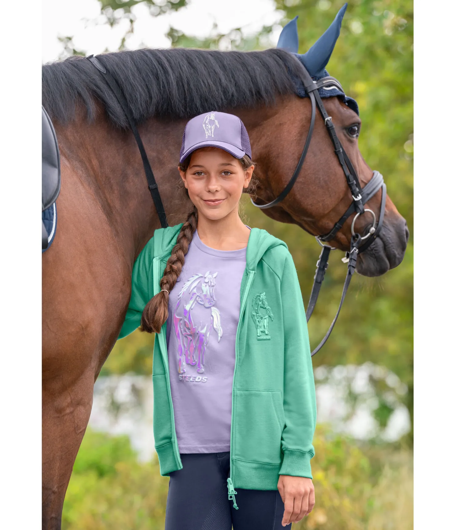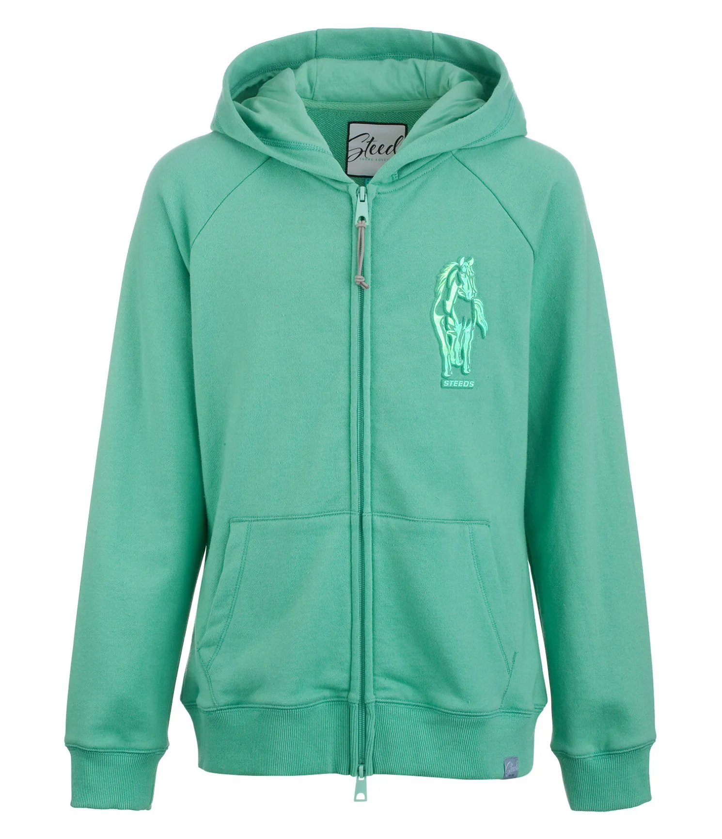 Veste sweat à capuche confortable. Fermeture à glissière bidirectionnelle. Joli imprimé cheval en relief à l’avant et slogan « Young Equestrian » au dos. Finition en maille côtelée sur le bas des manches et l’ourlet. 65 % polyester, 35 % coton.