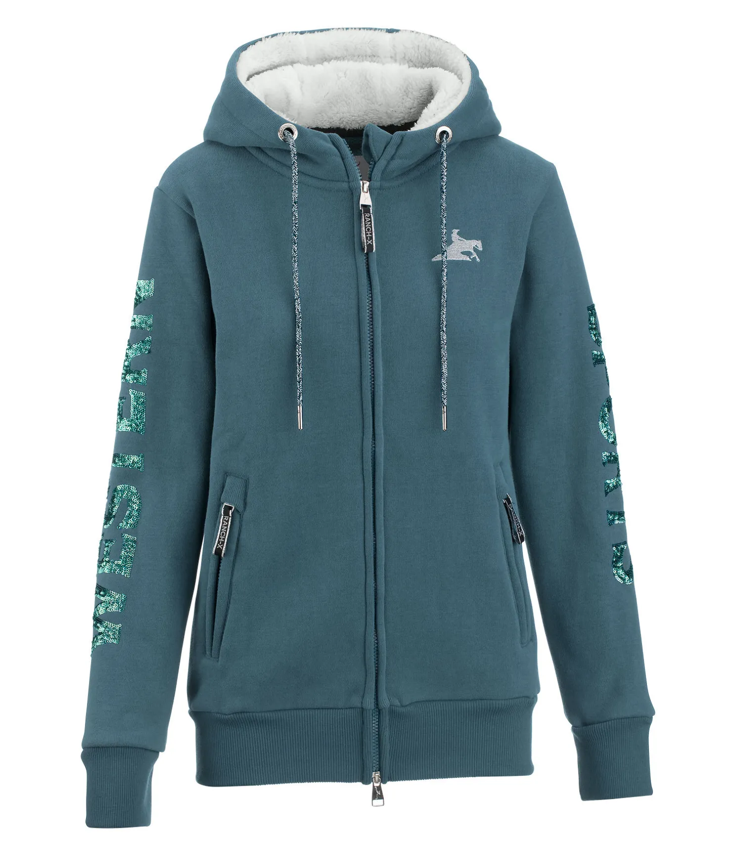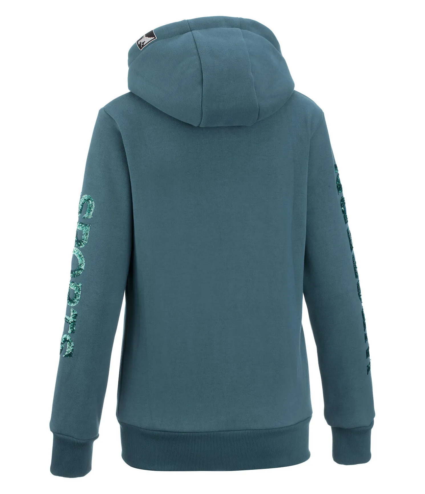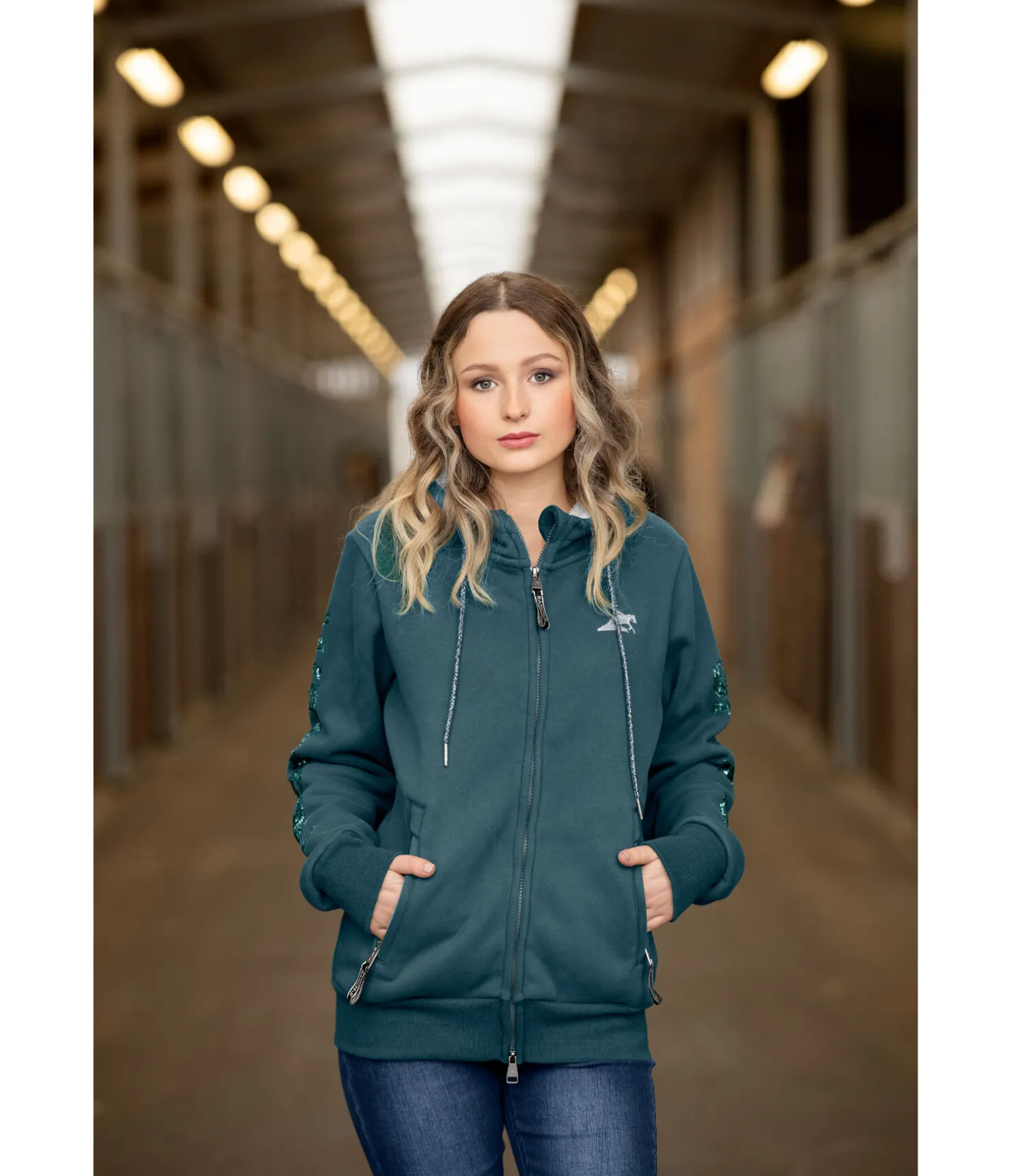 Veste sweat à capuche. Sportswear. Capuche avec doublure douce et cordon de serrage scintillant. Fermeture à glissière double sens. 2 poches latérales zippées. Inscription pailletée sur chaque manche. 55 % coton, 45 % polyester.